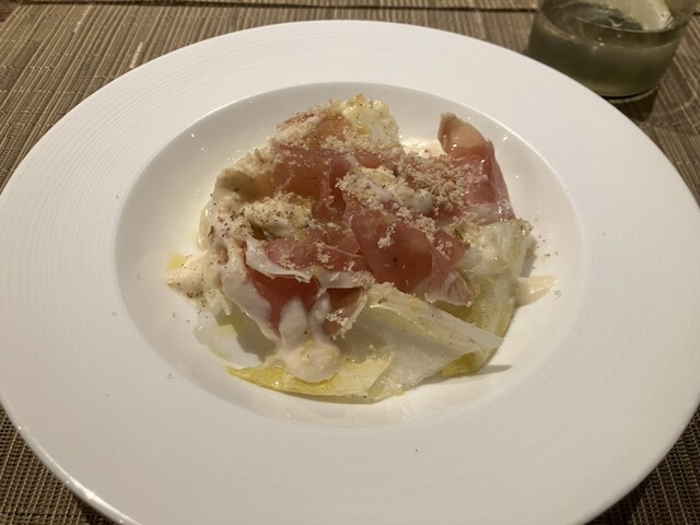 お次はアンティーブ(チコリ)と生ハム、洋梨とブルーチーズのサラダです。林檎のドレッシングが絶品です。今迄、洋梨は好みでありませんでしたが、こんな美味しい洋梨は初めてで驚きました。