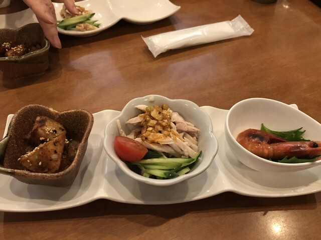 前菜は有頭エビの湯引き、棒棒鶏、南瓜の金平、モヤシと搾菜の和物。続いて未だ他のお店では出会った事ない分厚い豚の唐揚げの黒酢酢豚。点心はフカヒレ餃子、海老餃子と小籠包。分厚いのに何故か柔らかいイカのカシューナッツの唐辛子炒め。すんごく朝天唐辛子の辛さがイカに染み染み。最後は日本一の麻婆豆腐とご飯。最後に爽やかな甘さでとっても上品で滑らかな杏仁豆腐でご馳走様でした。