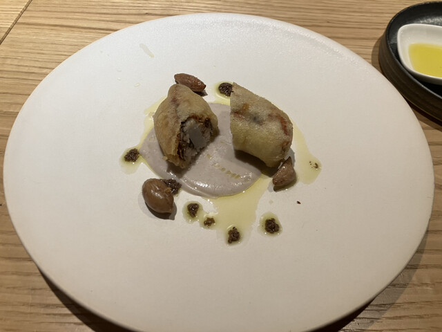 魚のメニューは秋刀魚と里芋のフリット、里芋のソースで落花生とブラックオリーブのペースト添え。