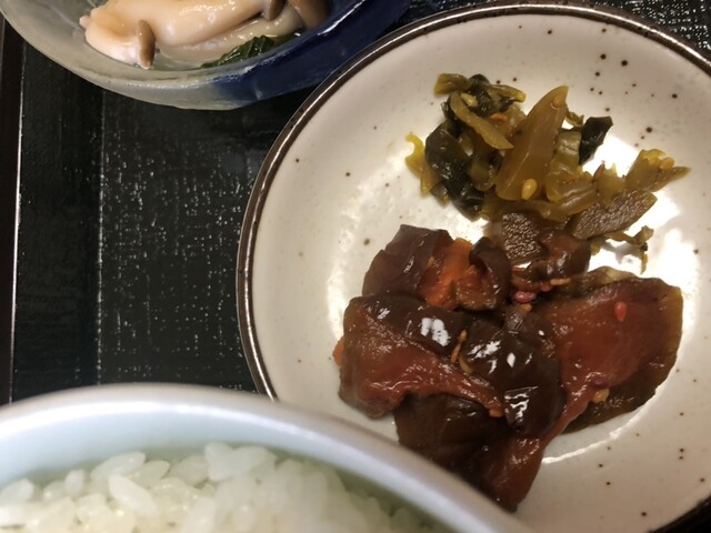 後は絹漉し豆腐の梅肉乗せ、卵焼き、蒸し鶏?オクラと蒲鉾、茹でキャベツは薄っすら味が、漬物、ご飯はゆかりの乗った汁物はおすましですが鰹だしよりも昆布の風味がすごく感じる汁物