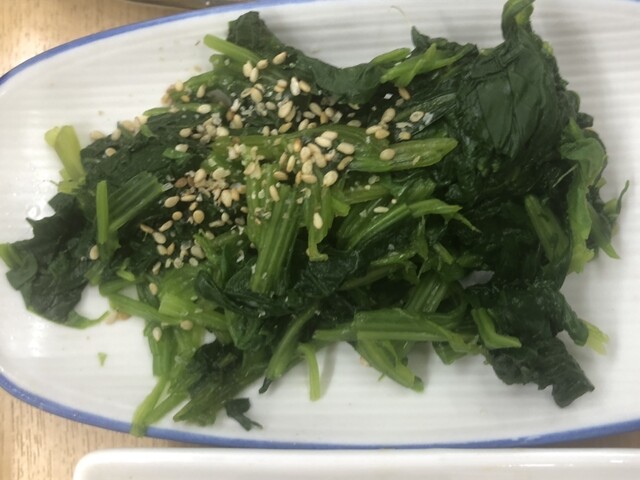 すり胡麻が乗ってるので薄甘いおひたしかと思ったんですが、ほぼ湯がいただけのほうれん草でしたのでお醤油を........