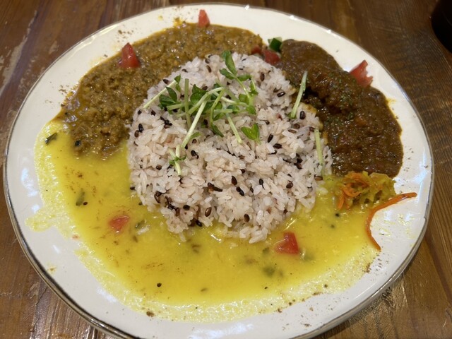ポークキーマ/チキンカレーのあいがけ2種盛りを注文。