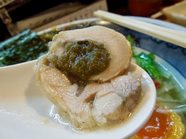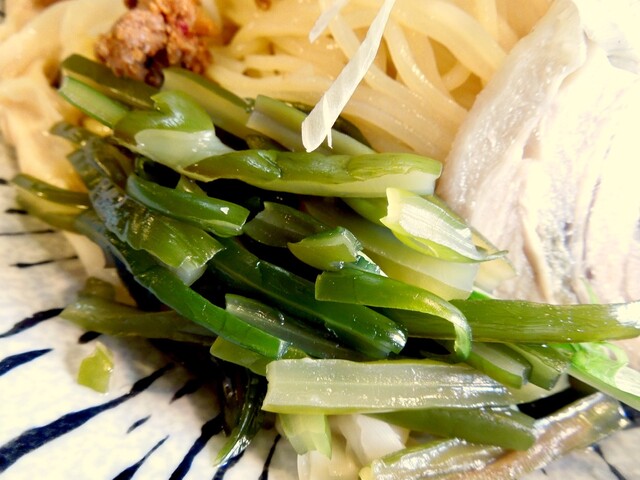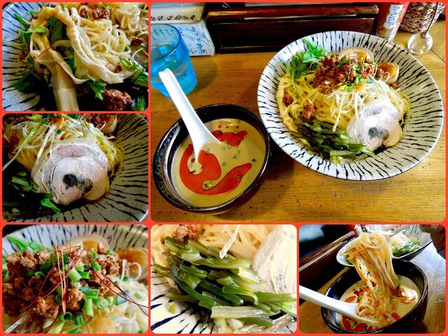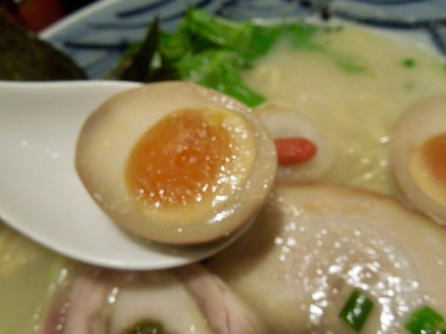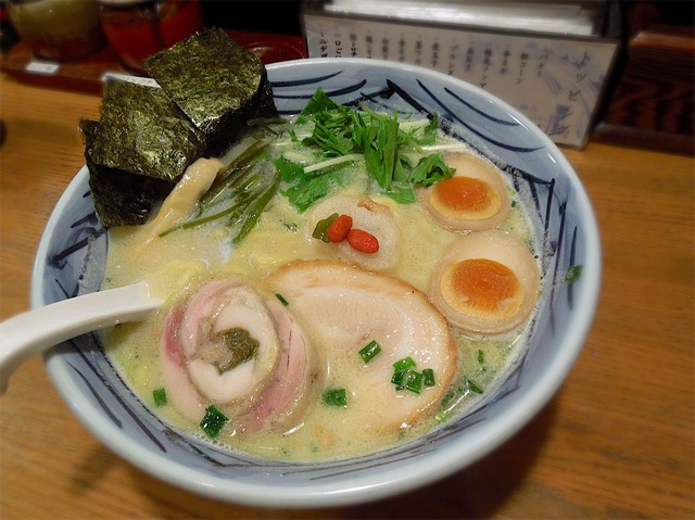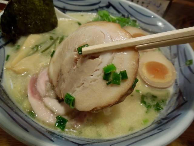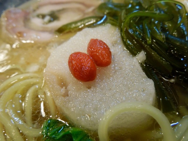 豚と鳥のチャーシュー、穂先メンマ、煮卵、茎わかめ、クコの実が乗ったお麩、水菜、海苔と具だくさんがうれしいです。
