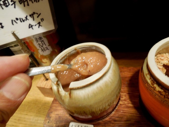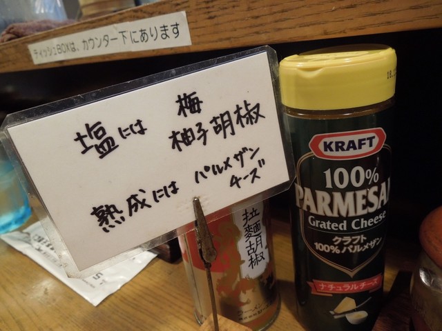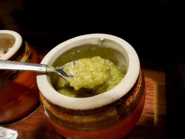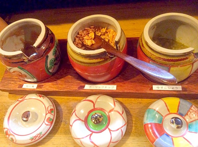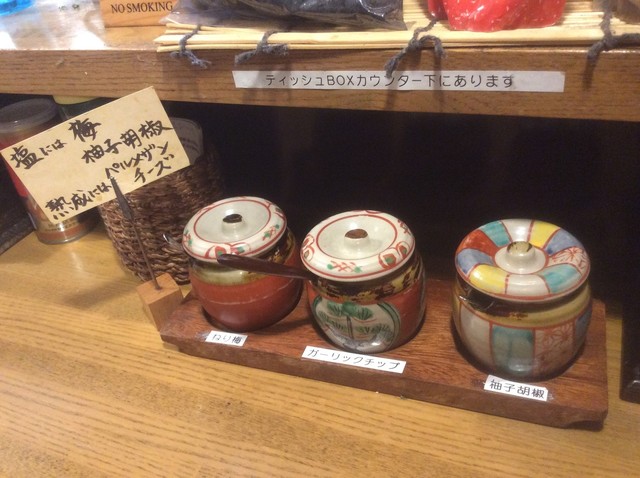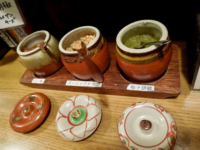 途中、カウンターテーブルに置かれた練り梅、柚胡椒、フライドガーリック等で味変も楽しみ!