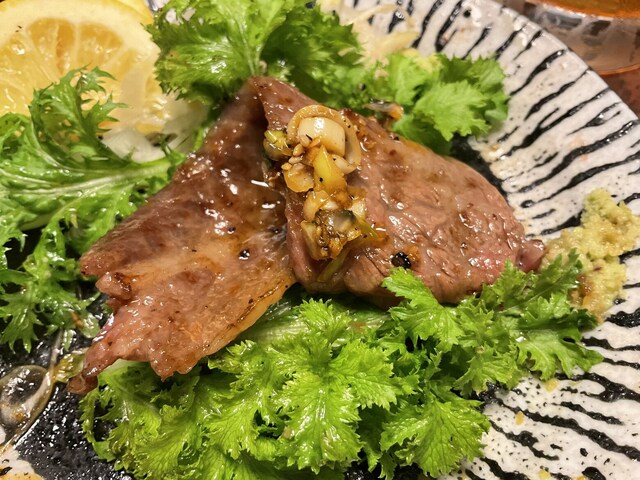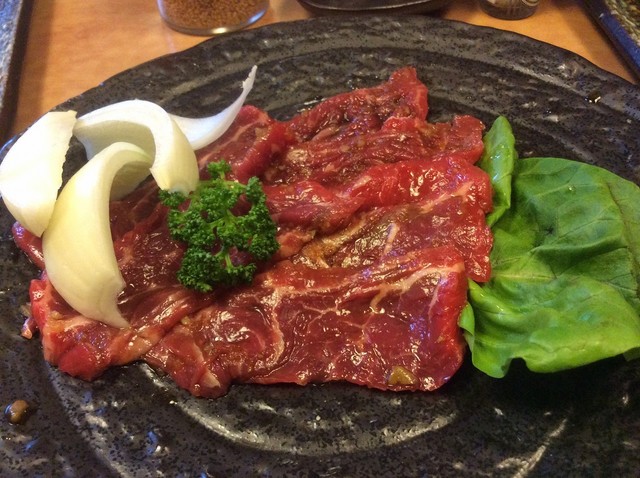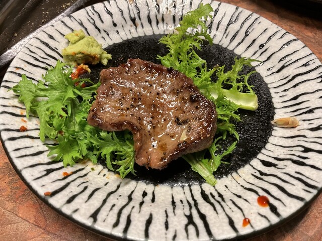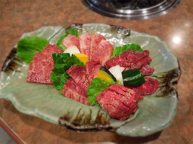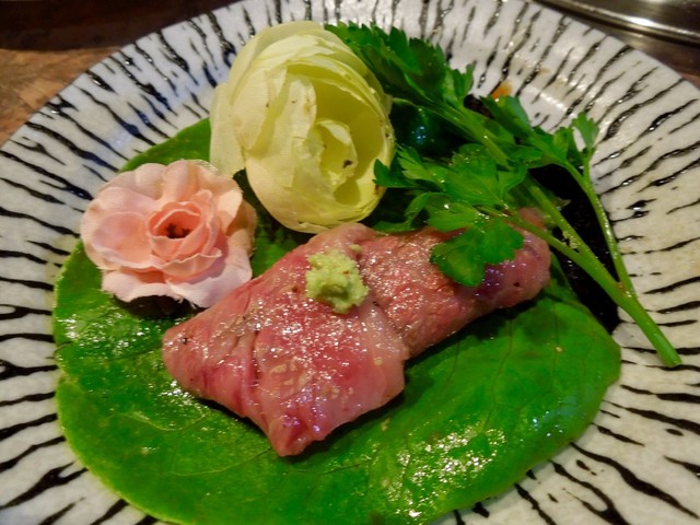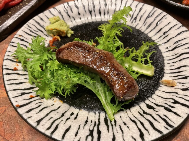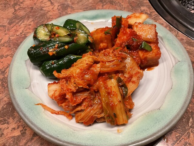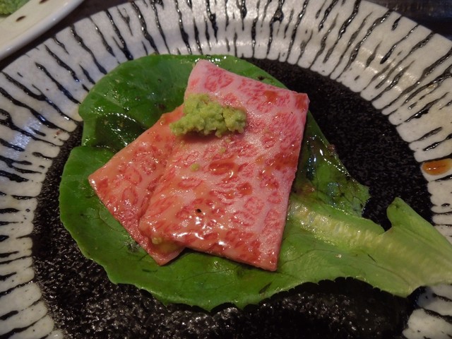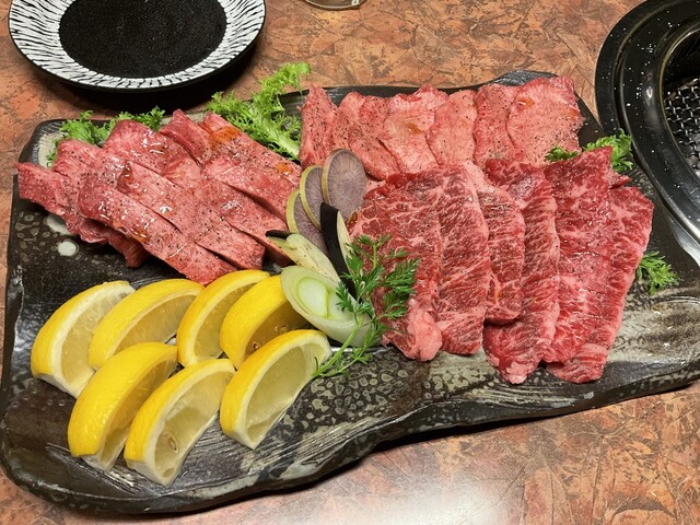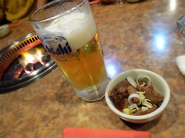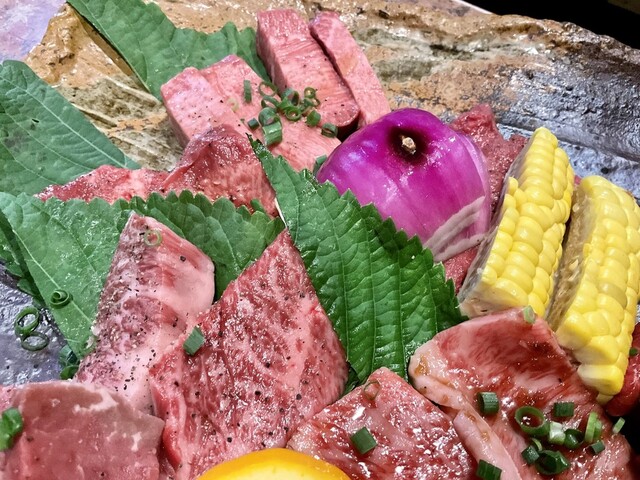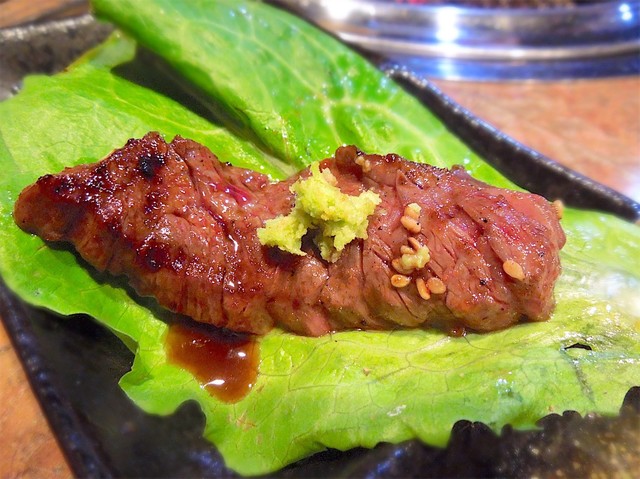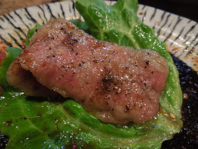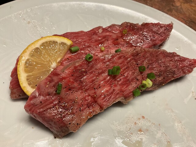いつもの様にお肉はお任せで頼み、バラエティに飛んだ良いところをチョイスしてくれ大満足。タン元、上タン、カイノミ、ハラミ、インサイドスカート、特上カルビなどレモン汁、わさび、生姜、辛味大根を醤油でサッパリ美味し!ワインが合いますね。