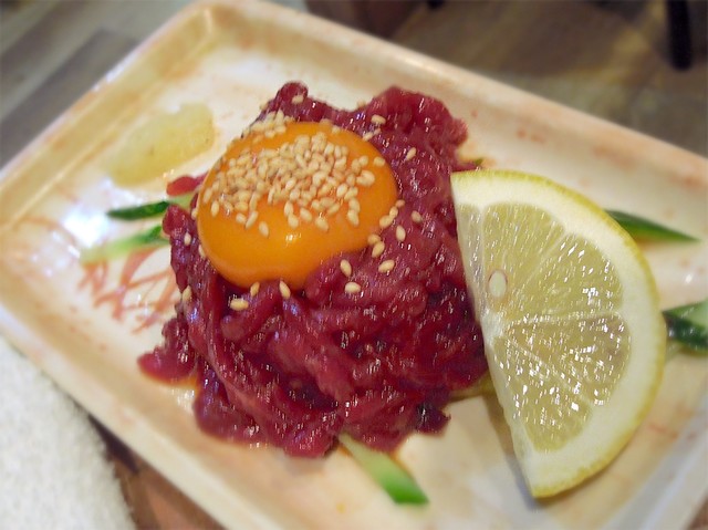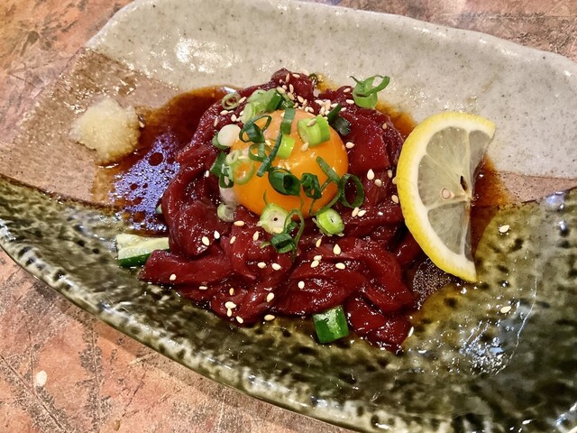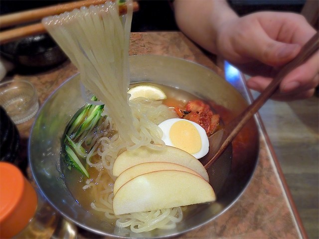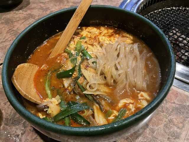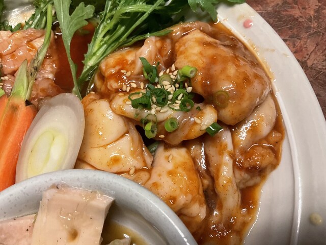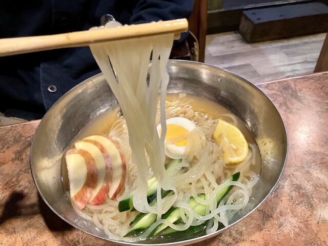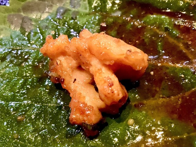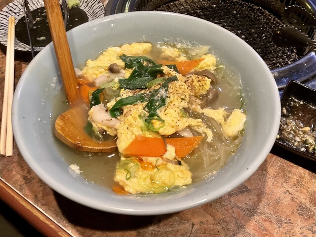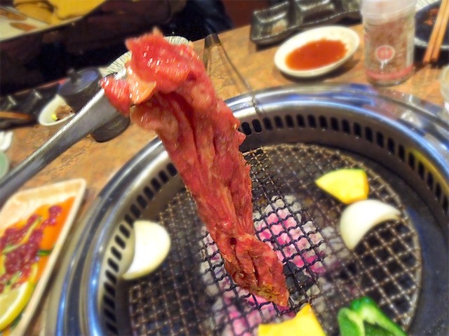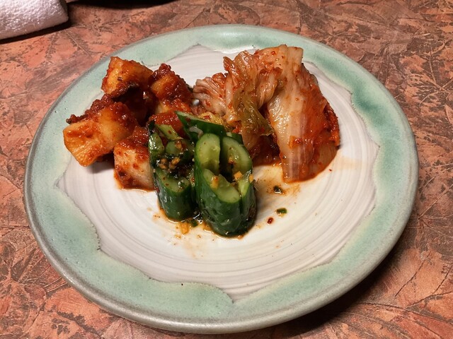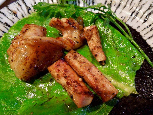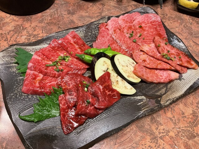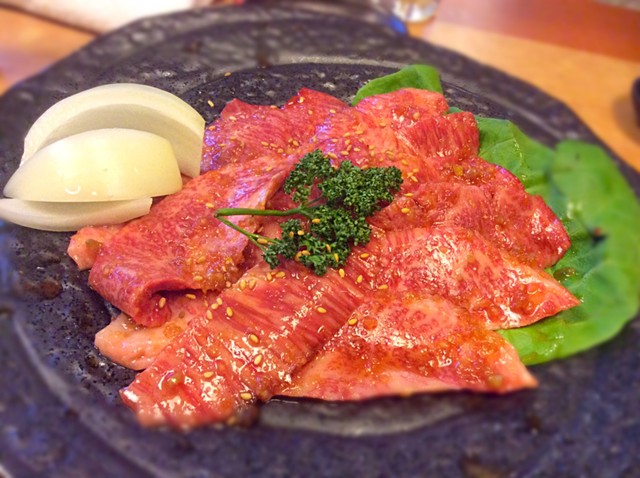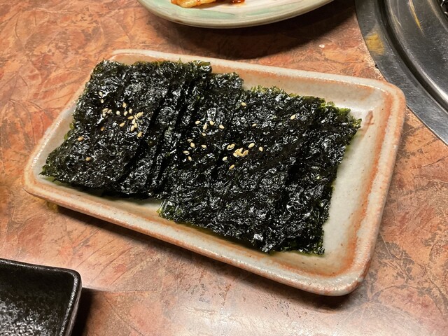 いつもの様にお肉はお任せで頼み、バラエティに飛んだ良いところをチョイスしてくれ大満足。タン元、上タン、カイノミ、ハラミ、インサイドスカート、特上カルビなどレモン汁、わさび、生姜、辛味大根を醤油でサッパリ美味し!ワインが合いますね。