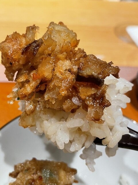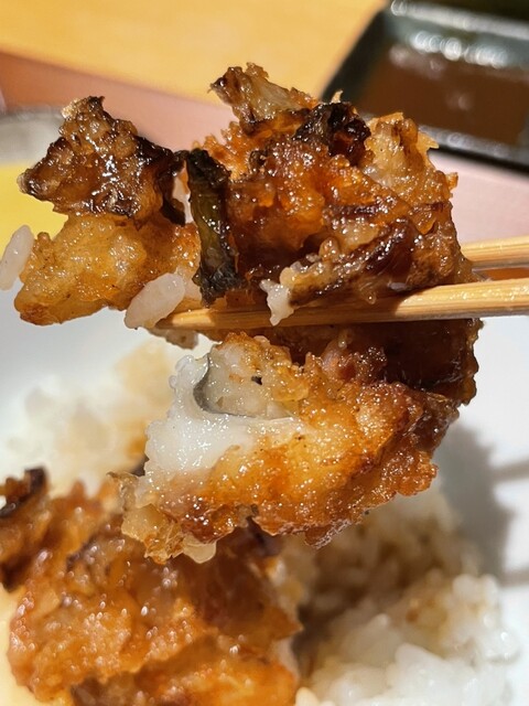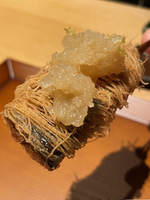 穴子は香ばしく揚げられており山椒が効いたソースとゴボウの風味が合わさり一緒に食べると最高に美味い
