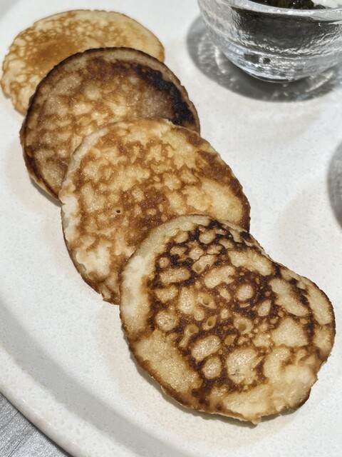 焼き上げたばかりのブリニー(パン)にたまごやサワークリーム、高級キャビアを乗せアレンジして食べる一品