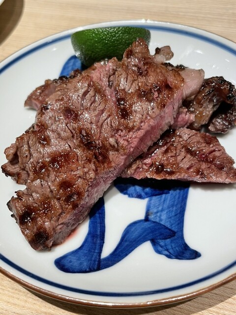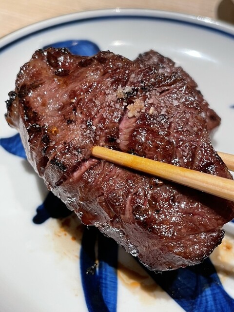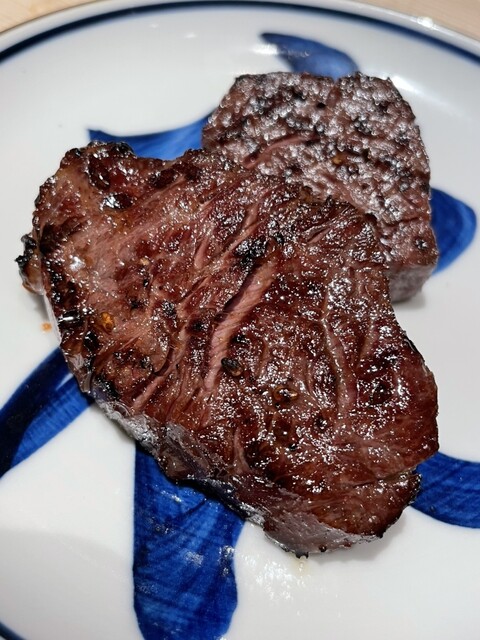 丁寧に焼いてこちらを食べやすいサイズにカットしてくれて、外側は香ばしく中はレアで最高に美味い