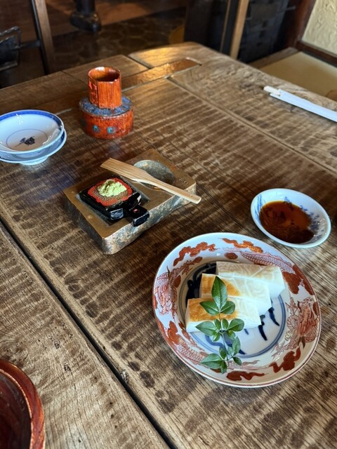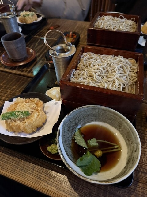 粗挽きの蕎麦がき、せいろ、にしんそば(小)と甘味付きねフルコース。小鉢で玉子焼きも!!