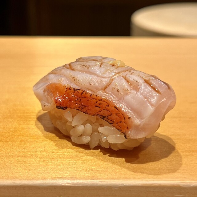 金目鯛 炙りで香りと甘みが増し山葵のさわやかさと後から辛子の風味がやってくる味の変化が楽しい