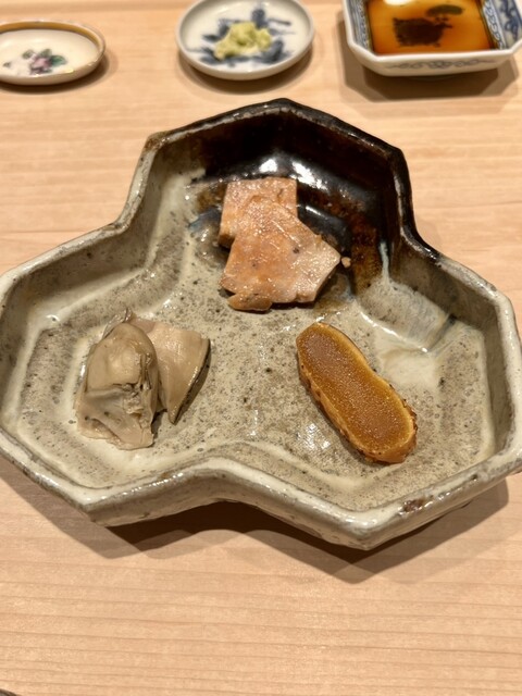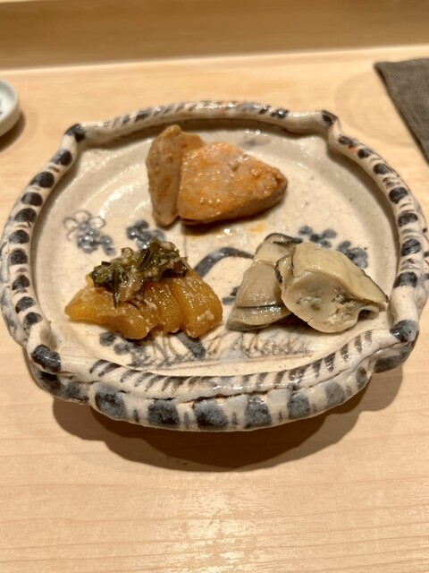 珍味3種盛 鮟肝 安定のとろけ具合 牡蠣味噌漬け 牡蠣の味わいが増幅されますね 唐墨 今回印象的だった一品 味噌の風味も加えられ柔かく濃厚な味わいにビックリ!