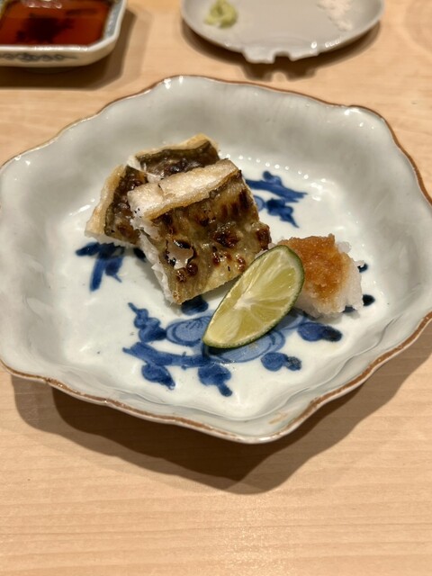穴子白焼 身の厚い穴子を炭焼きで 絶妙な火入れで外はパリっと中はふわりと柔らか 山葵と塩で