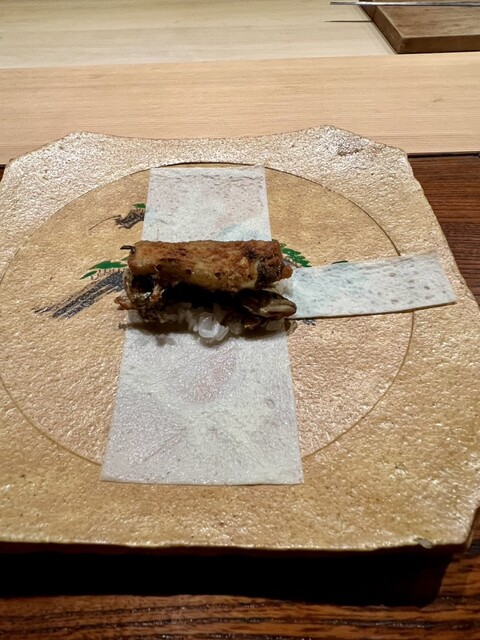 滋賀岩魚の絹巻き寿司 頭と骨は揚げて 揚げた岩魚を炭焼きで 北海道竹内養鶏場の米艶という白い卵黄の薄焼卵で手巻きに