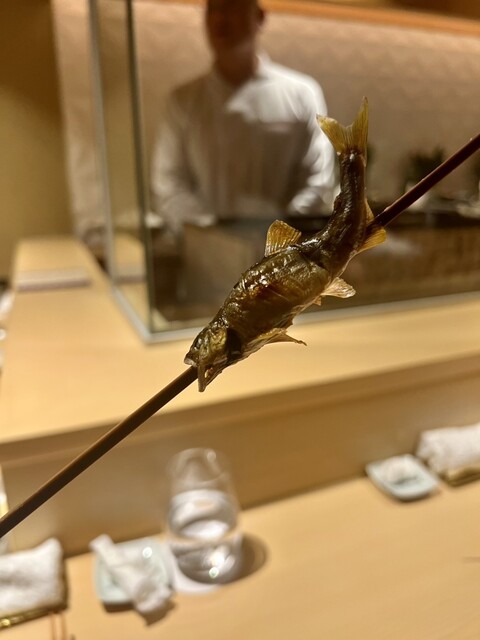鮎塩焼きの握り 酢橘の酸味をまとい鮎の香りと優しい舎利でまとまりのよい寿司になりますね 初めての味わいに興奮してしまいました!