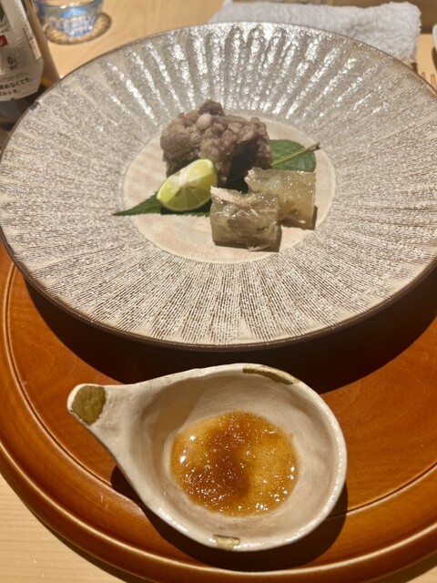 すっぽん唐揚げ えんぺら煮凝り すだち ちり酢 唐揚げを2種のつけダレで味わいます えんぺら煮凝りは生姜が効いてます