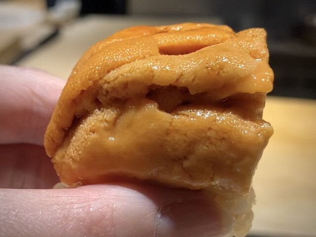 →自家製の生カラスミに衣は玄米衣を使用。帆立に生のカラスミが合わさってるのも初めてでしたが、さらに玄米衣の食感が面白い!!