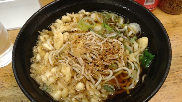 七味を振ってさ、そばに絡めて食べると、天かすの油もマッチして旨いのよ