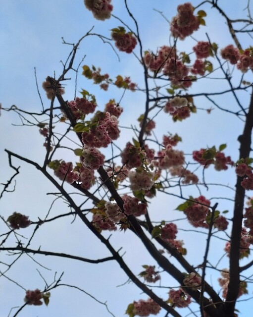 裏の公園にある八重桜は昨夜の雨で花弁が縮んじゃった感じ