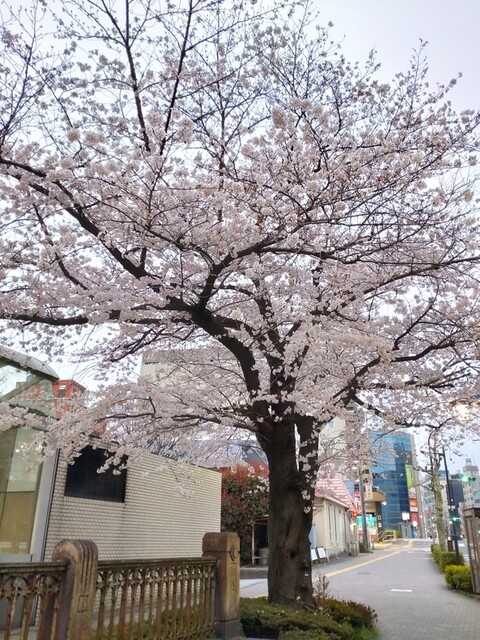 駒込駅の北口、改札を出て右側、交番の前に桜の木があります