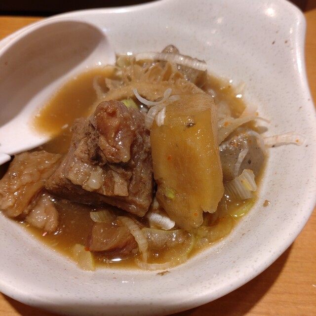 肉、ホルモン部分、こんにゃく、ごぼうが入っててネギが盛られている