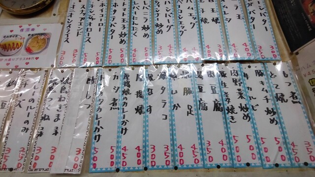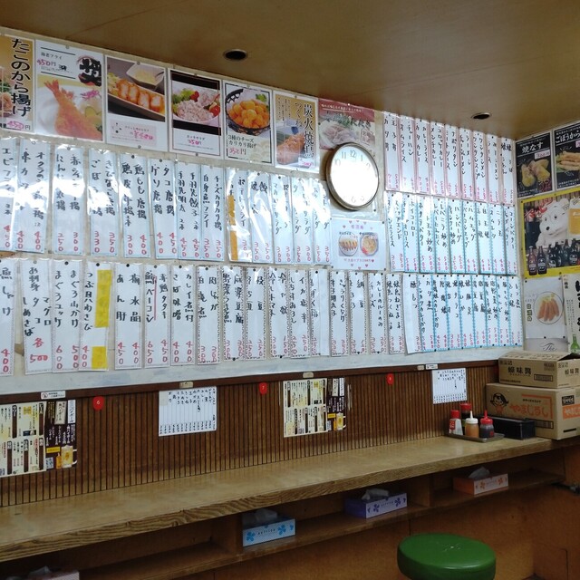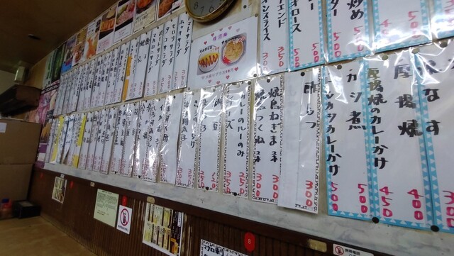 高台には惣菜があり、壁面いっぱいにメニューが!