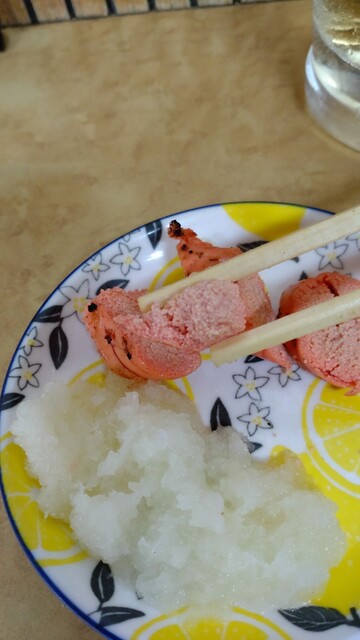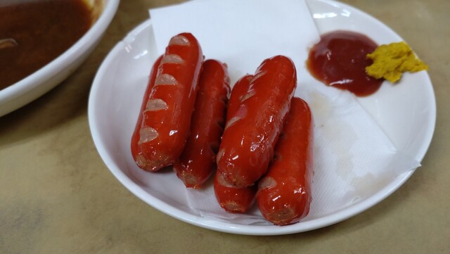 赤ウインナーをレバタレにつけて食べるのも良し、辛子でも良し