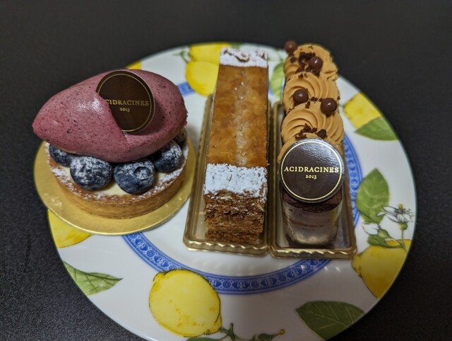 右からブルーベリーのタルト、ミルフィーユ、キャラメルのケーキ(ケーキの名前は覚えてないです。)