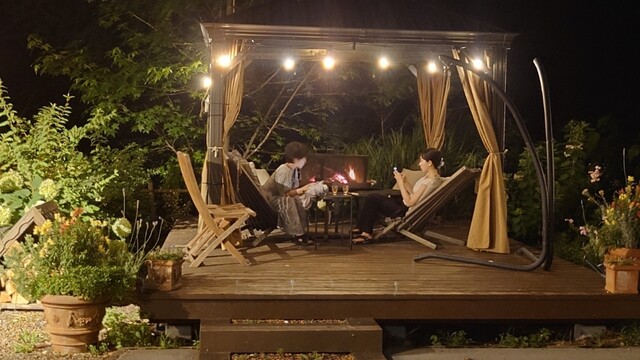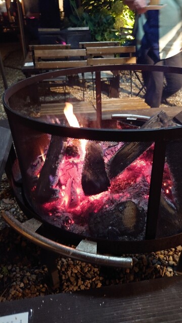 あちこちにある薪火も幻想的です。アペリティフや食後をアウトドアで薪火を見ながら楽しめます。
