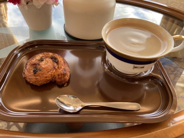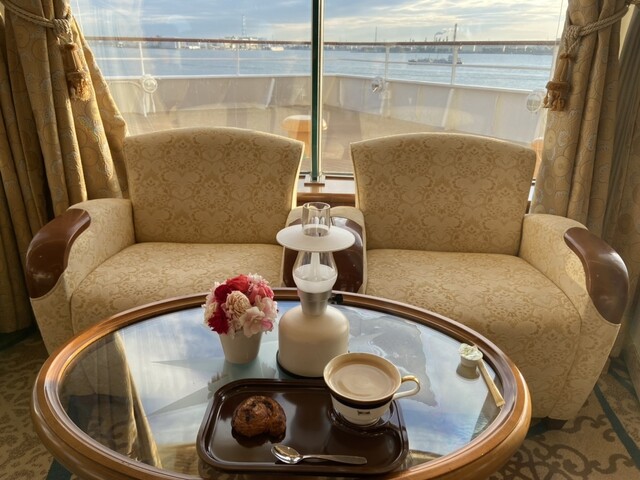 朝食は、メインダイニング『瑞穂』で和食のお膳。日本の朝ごはんらしいメニュー。お米が美味しく、おかわり。食後は、ここでコーヒーも頼むことが出来たけど、敢えて船首にある『ホライズンラウンジ』に移動。眩しいくらいの朝日に包まれながらブレンドコーヒーとデニッシュを頂いた。
