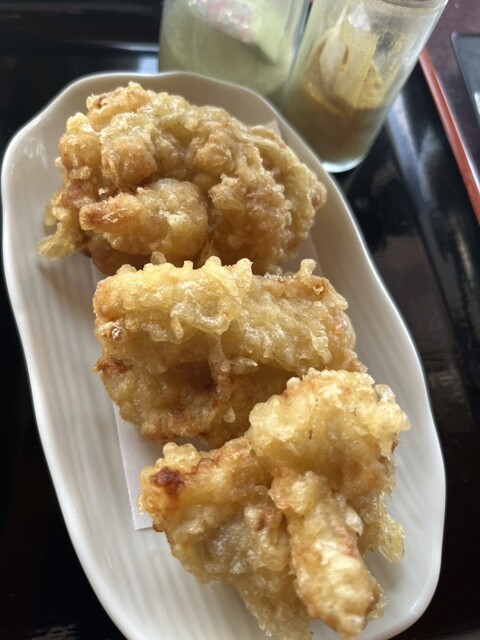 天ぷらも、カレー塩と抹茶塩が提供されて、どちらで食べても美味しい。ブロッコリーも蓮根もサクサク、とり天はとってもジューシー(๑˃̵ᴗ˂̵)下仁田ネギは味噌ダレで戴きますが、とっても新鮮で甘みがあります(≧∀≦)