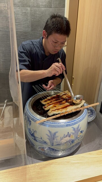 カウンター6席でゆったりです。目の前には備長炭の入った焼き場がガラス越しにたっぷり見ることができます。その横には火鉢のようなおおきな器に入った秘伝のうなぎのタレが。。。よだれがでます笑