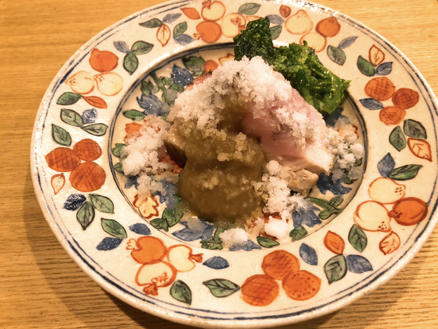 天然とらふぐの刺身は、白子のソースとポン酢のジュレで。