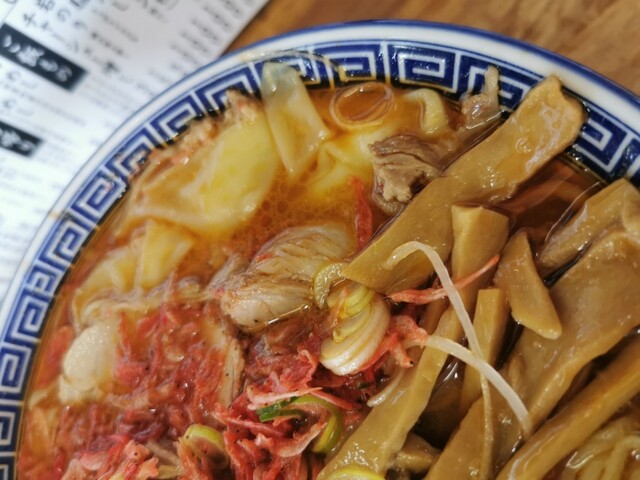 麺は、店長さん拘りの【京都 麺屋 棣鄂】のウイング麺を使用されています。平打ち麺?で食べ易い太麺系ですね❣️この麺は、初めて食べたが美味いですね!小麦の味も感じられる!チャーシューも皮ワンタンもスープに絡んで最高に美味しくいただきました!味玉もトロトロで美味い。