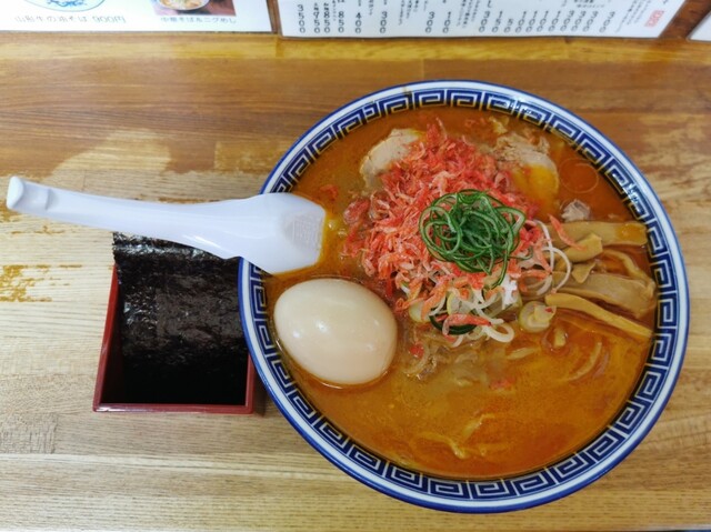 海苔を乗っけて頂きました❣️濃厚な海老味噌仕立てで、スープはコッテリな感じです!