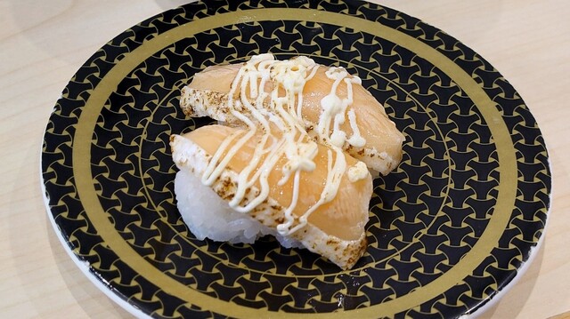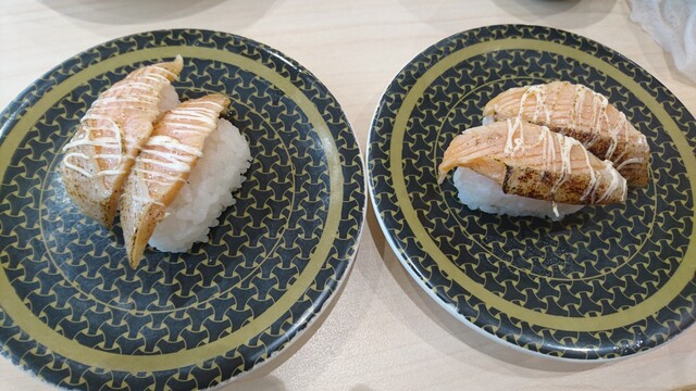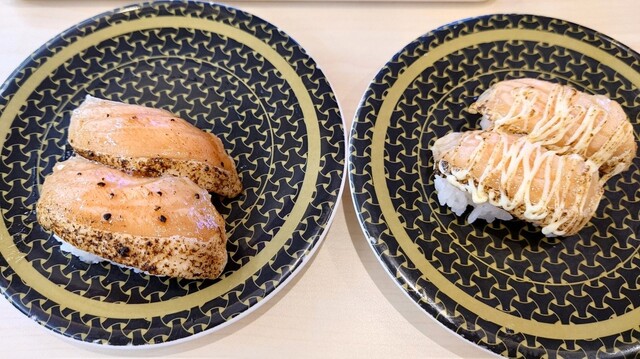 炙りとろサーモン2、全て税込み97円(平日値段)