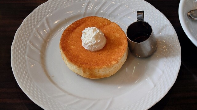 モーニングセットのミニパンケーキ、カフェインレス珈琲はミルク投入済み