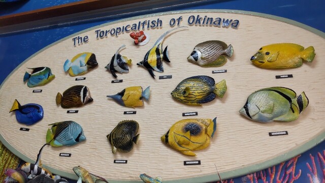 最近たまたま知った魚まるさんに、沖縄3日目の2軒目として平日12時45分頃初訪問。ゆいレール赤嶺から徒歩10分弱。外に数人待ってます。店内のウエイティングリストに記名。no,4でした。外に出て待ってると中華系の方が次から次ぎにやって来ます。10分も待たずに名前呼ばれて店内へ。至るところに魚のオブジェが飾って有りますね。
