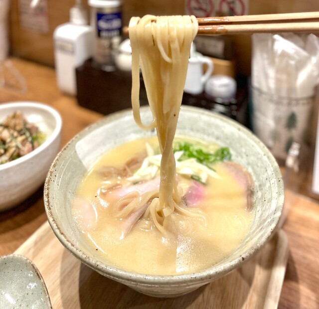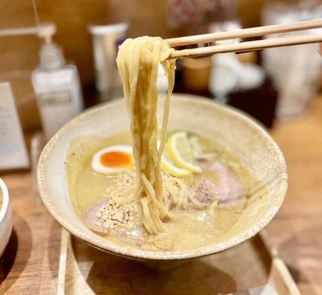 麺には、カナダ産小麦1CW1等粉多加水平打ち麺を使用されており、フォーの様な、きしめんの様な、うどんの様な…不思議な麺で、柔らかな食感ですが放たれる艶やかな小麦の香りが鼻腔をくすぐります。