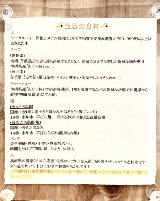 トッピングには白ネギ、あぐ一豚チャーシュー1枚、丹波黒どり手羽元肉2個、生ワカメ、メンマ、そして春をイメージしてさくらカイワレや食用菊を使用、さらに開店5周年を感謝して500杯目まで味玉半個が無料トッピングさせる嬉しいサービス。