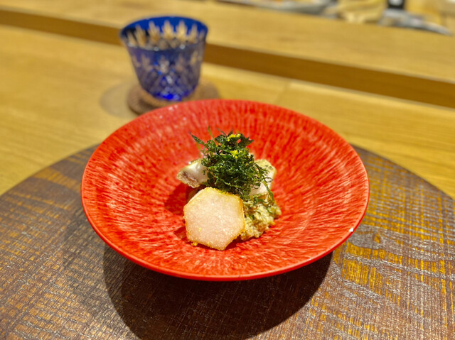 季節ごとの最高の素材を調理して盛り付けるプロセスが、こちらの視線と心を店主の手元に引き付けて、カウンターに楽しい一体感をもたらし見ている段階からご馳走。