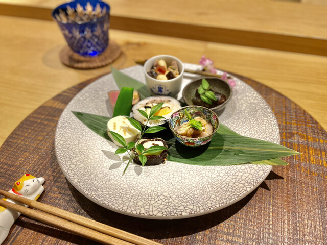 この日は烏賊素麺や苺白和え、かつたく巻に青紅葉が添えられた季節感満載の一皿となっていました。