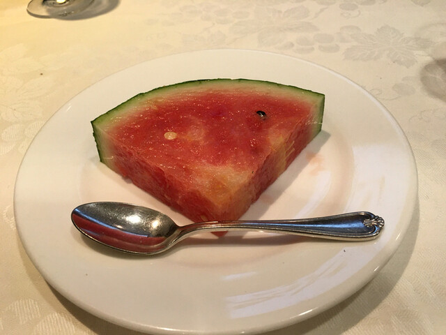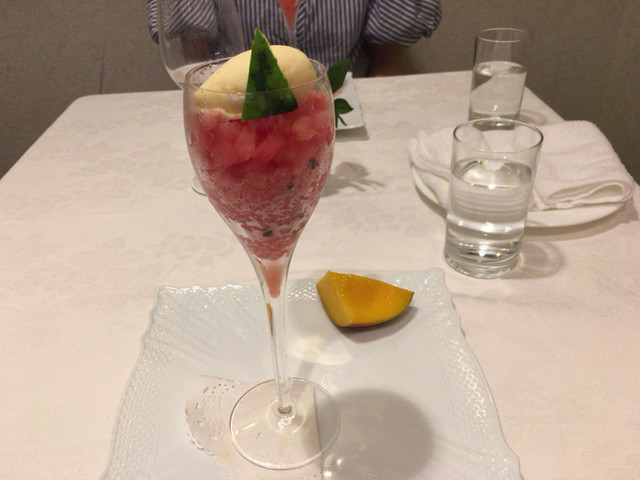アミューズ2品、冷前菜、温前菜、魚メイン、肉メイン、口直し(スイカ)、デセール、プティフルール、コーヒーor紅茶