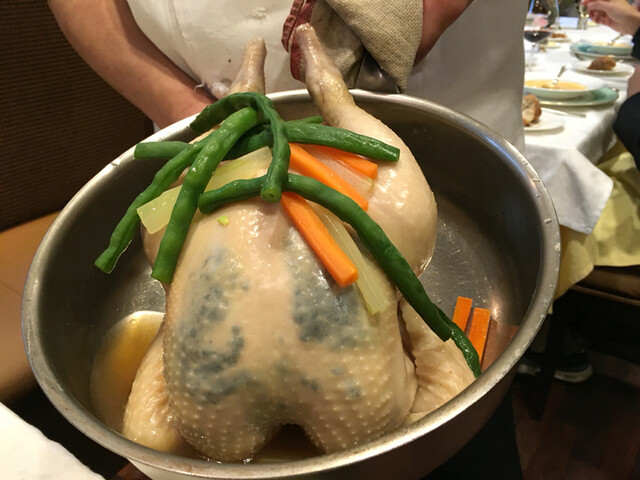 『ドゥミ・ドゥイユ』とは日本語で『喪服風』という意味らしくて、鶏の身と皮の間にトリュフを入れて、喪服に見立てて、それを茹でて調理するそうです。