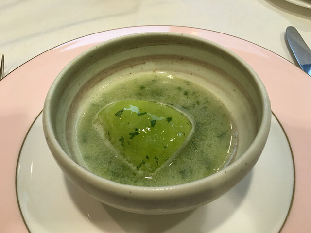 ホワイトアスパラは、この日はアサリの出汁に木の芽、マスタードで味を整えたスープ仕立て。