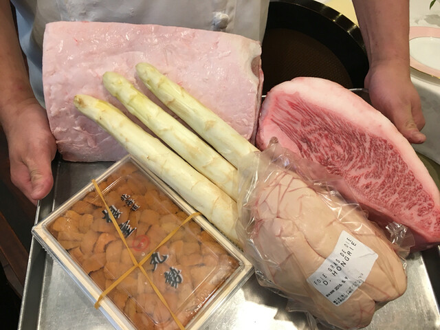 ①冷前菜…ウニのコンソメゼリー寄せ(スペシャリテ)、大目鮭のマリネ(春)、マルブレ(冬)、フォアグラのブリオッシュ包み、鮎のコンフィ(夏)