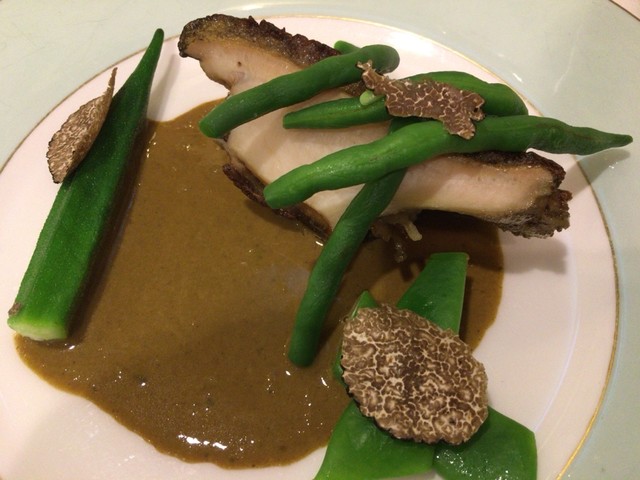 アンディーブをバターでコンフィしたものが下に敷いてあるのですが、これが信じられないほど甘くて美味しい。全てが計算し尽くされた一皿。