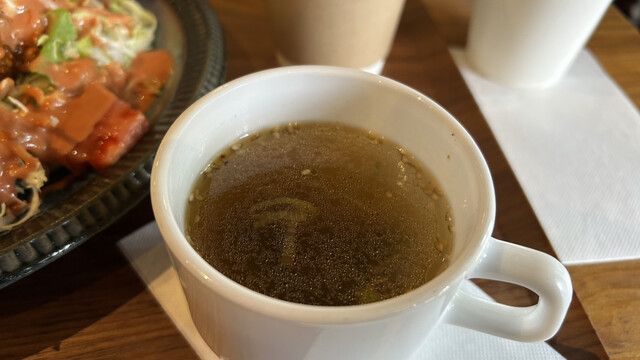 カフェの定番メニューって言われて何が最初に思い浮かぶ?先週も書いたけど俺としてはナポリタンが一等先にくる。それに続いてって考えるとピザトースト等のトースト系、シンプルにトーストから始まってチーズトーストやちょっと凝ったヤツだとクロックムッシュとかフレンチトースト。パンケーキは昨今の流行りだが、昔ながらのシンプルなバターとハチミツだけのが喫茶店ぽい。ご飯ものだとチキンライスやオムライス、そしてカレーライスもありかな。って事で今日のCOTE CAFEでは「バターチキンカレー890円」に「サラダとスープ200円」をセットにして注文。ご飯は少なめにした。引き続き「転スラ」を読みながら待っていると5分ちょっとで運ばれて来た。バターチキンカレーは久しぶりだな、って思いながら先ずはスープをひとくち。うっ、美味しい。シンプルな味付けなんだが奥行きと旨みがある。コンソメと言うよりはブイヨンに近い感じで動物系の出汁の旨みが勝っている。ほのかな甘みも好み。このスープとサラダで200円のセットはかなりお得感がある。一方のバターチキンカレーは以前と評価は変わらず万人が受け入れる味。美味しいが記憶には残らず流れていく日々の大半の食事の一つ。でもこれが大事だと思う。午前が終わって午後に向けて、食べる事で何かを切り替えて補給する。その日々のルーティン的儀式にも似た行為に毎回大逸れたものが必要なわけじゃない。そう言う観点から今回のスープはとても愛おしい味だった。ご馳走さまです♪