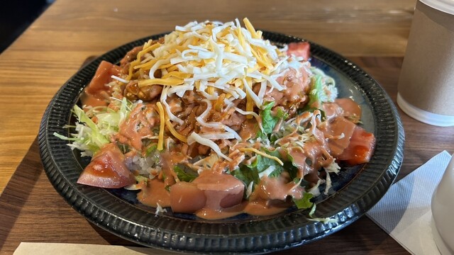 たこ八郎こと斉藤清作氏が日本フライ級チャンピオンとなったのは1962年の事である。俺が生まれたのも同じ年だから、たこ八郎とは22年歳が離れている。たこ八郎を認識したのは「笑っていいとも」に出演する様になってからだから晩年に近い。確か鎌倉の海水浴場で酒を飲んで海に入り溺死した。「たこ、海で溺死」と新聞で報じられたが赤塚不二夫氏やタモリなど多数の芸能人が彼の死を悼んだ。アル中でパンチドランカーと言われ特異なキャラでカルト的人気があったが、愛されキャラだったのだ。味わい深い人柄だったのだろう。さて、味わい深いと言えば目の前のタコライス。そう、COTE CAFE今日の日替りは「温玉とオーロラソースのタコライス990円」にブランドコーヒーSサイズをセットにして計1,230円。たこ八郎が蛸じゃない様にタコライスにも蛸は入っていない。タコス+ライス転じてタコライス、沖縄のソウルフードのひとつとして知られている。タコスの具材としてチリパウダーやパプリカ、オレガノ、サルサソースで下味を付け炒めた牛ひき肉、タコミートをご飯にかけてレタスやシュレッドチーズ、トマト、アボカドなどを散りばめるのだが、何と今日はさらに温玉とオーロラソースを加えるというパワースタイルの様相。たこ八郎もプロボクサー引退後はコメディアン、声優、俳優とごちゃ混ぜマルチな才能だったが、目の前の皿も混沌たる様子。端の方からトマトにオーロラソースを絡めてタコミートと混ざったご飯をスプーンで口に運ぶ。タコミートとオーロラソースが複雑に絡み合い融合する。旨い、これはありだな。今日のオーロラソースはベシャメルソースとトマトピューレを合わせたものだろう。ケチャップとマヨネーズで作る簡易なものと違ってまろやかに思う。それがいい感じでタコミートに合っている。そこに温玉をスプーンで割り流れる黄身を纏わせるとグレードアップ!濃厚な奥行きが更に食欲をそそるのだ。早食いは良くないのだが、スプーンの回転が上がる。よく咀嚼すべきなのだが流れる様に胃に入ってゆく。今日の俺の食道はハイウェイになってしまった。タコライスを食べてたこ八郎を思い出すというしょっぱい話になってしまったが、たこ八郎はタコライスを食べた事あったのかな?ちょっと気になる、ご馳走さまです♪