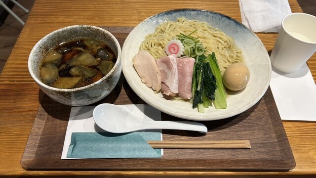 ラーメンカフェ週替りメニューは「茄子と鶏の昆布水つけ麺990円」。昆布水つけ麺って数年前から出てきて流行っている印象がある。以前食べたのは麺の盛り付け方が一本一本空いた様に綺麗に並べてあったが、ラーメンカフェでは結構無造作な感じ。昆布水もとろろ昆布が混じっており、経験とは違っていた。一番特徴的なのはつけ汁。茄子と鶏肉が熱々に煮込まれた汁は塩辛く、武蔵野うどんのつけ汁を思い出させる。本当に店の大将、一筋縄では効かない作り込みをしてくる。面白い。冷たく締められた香ばしい麺を先ず昆布水だけで食べる。昆布のぬるぬるが纏わりつきスルッと喉を通る。次に熱々のつけ汁に漬けて食べると昆布の風味が鶏の出汁と混じり合いちょうど良い甘辛さに変わる。麺の歯ごたえも感じ取れ食感が良い。トッピングの具も小松菜、煮卵、鶏と豚の2種類のチャーシューが載ってボリューミー。食べ応えのある一杯でした。昆布水インスパイア武蔵野うどん風な世界観、ご馳走様です♪